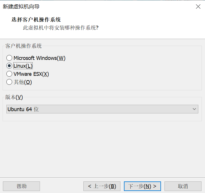 随后的一步,选择Linux和Ubuntu 64位操作系统