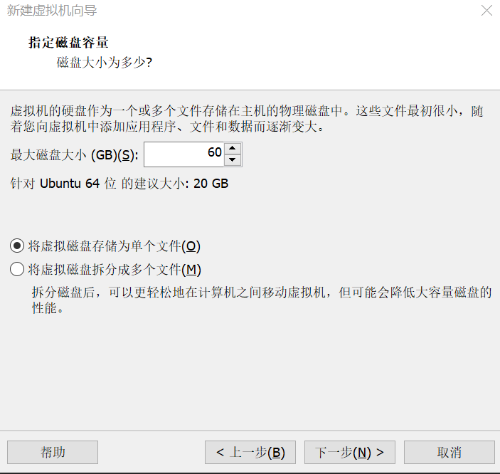 名称自己定,这个无所谓的。然后指定磁盘容量,这里磁盘大小请保证为50GB以上,因为大数据要用的软件都比较大,还比较多!!同时,为了性能,请选择储存为单个文件