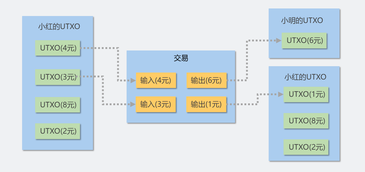 UTXO(未花费的交易输出)是非常重要的概念。在上面例子的第三步中,小红转出6元,使用了之前未花费的转账4元和3元,我们说这是两个金额为3元和4元的UTXO;小明收到了6元转账并且还没有花掉这笔钱,我们说现在他有一个金额为6元的UTXO;小红收到1元找零,小红有一个金额为1元的UTXO。