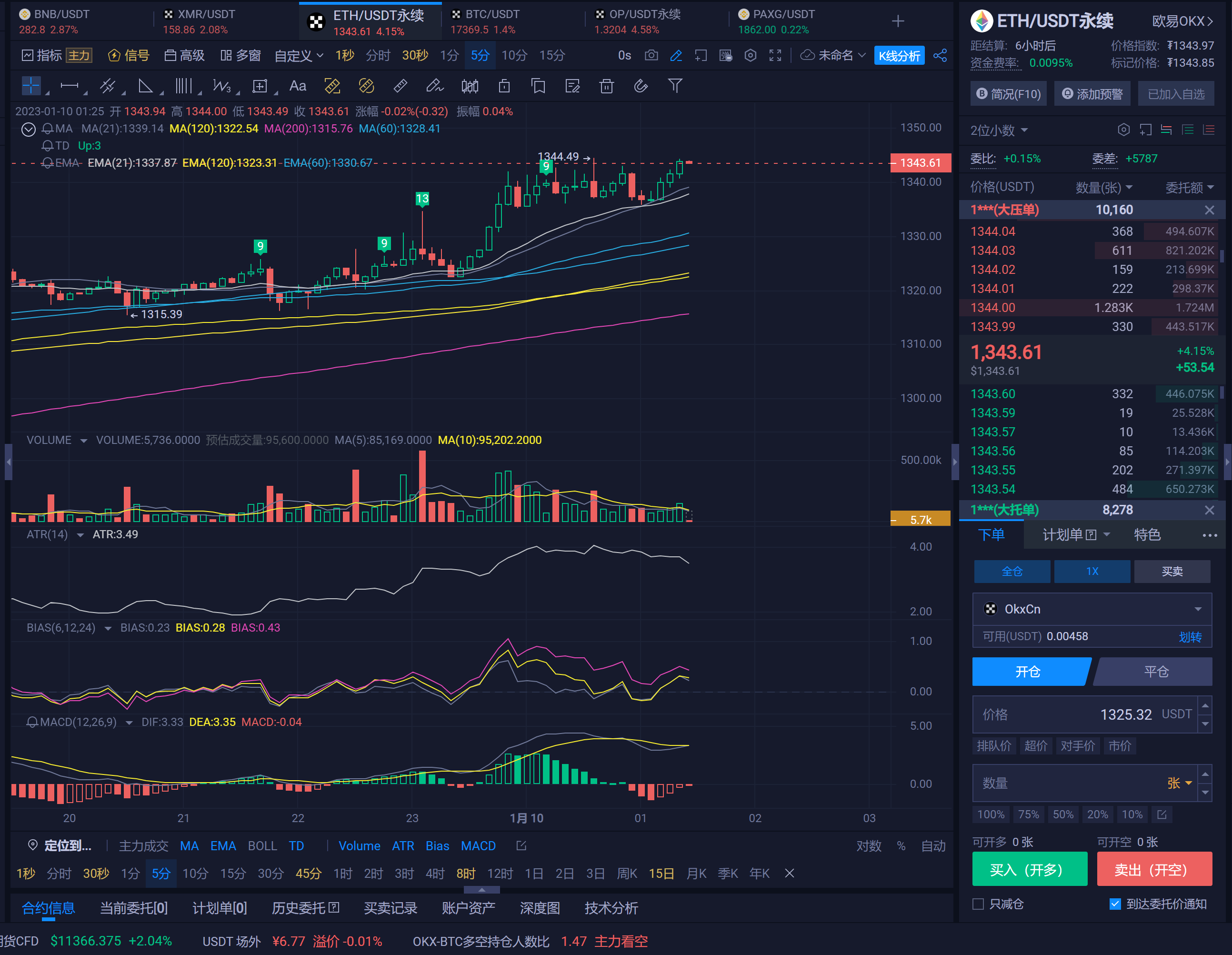 仅选取本金10%以下资金进行交易,以免出现大额亏损。开仓时设置止盈止损,5min图上止盈3-5%,止损1-2%;15min图上止盈5-8%,止损2-3%;1h图上止盈8-10%,止损3-5%。