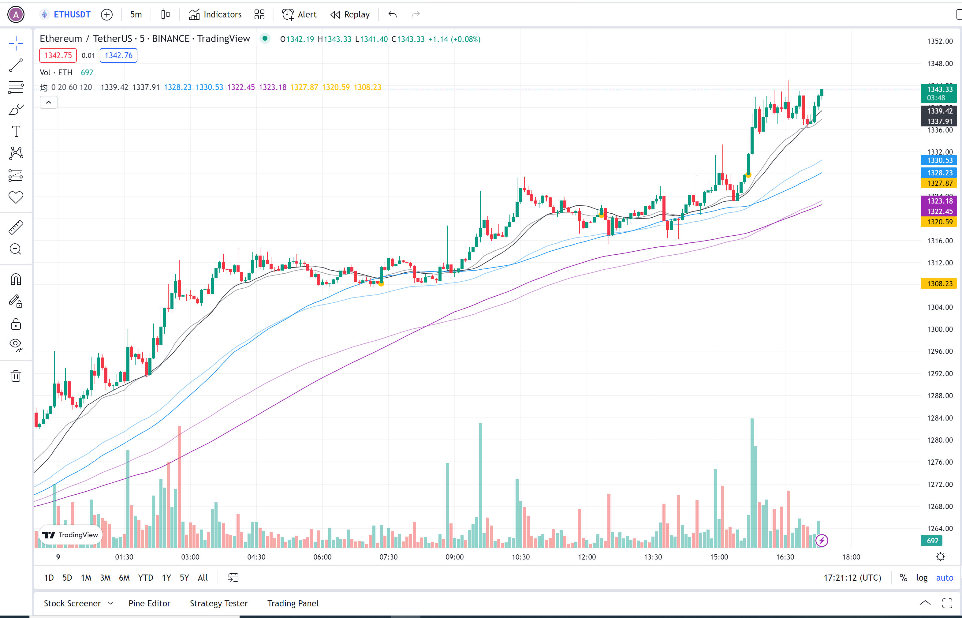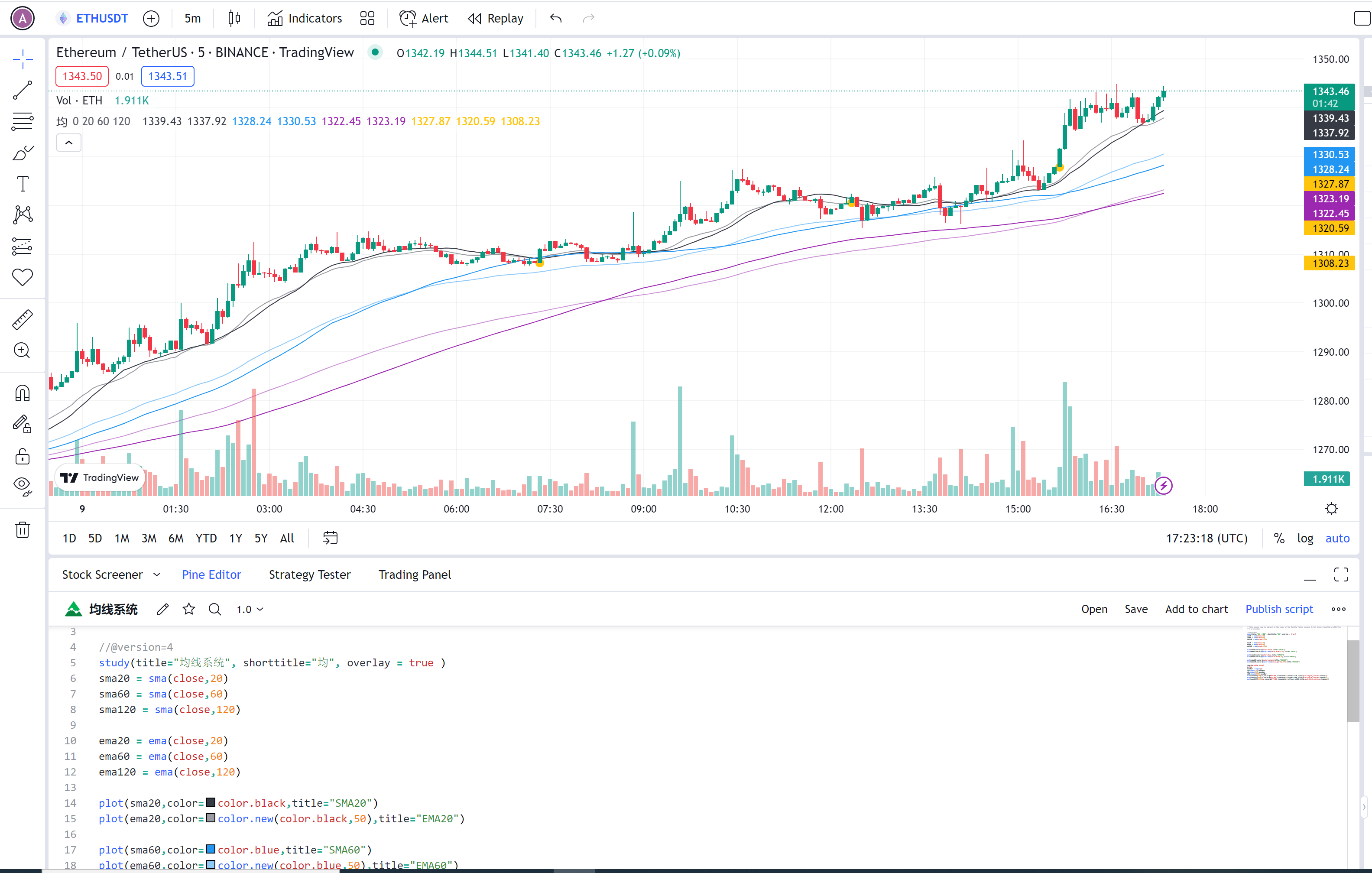 故可知,使用该策略的交易者不一定需要使用TradingView,在自己熟悉的图表工具上自行标注SMA(20,60,120)和EMA(20,60,120)即可。需要注意的是,不同图表工具上,关于SMA的称呼并不一致,有些亦称其为MA。即:SMA和MA是等价的。