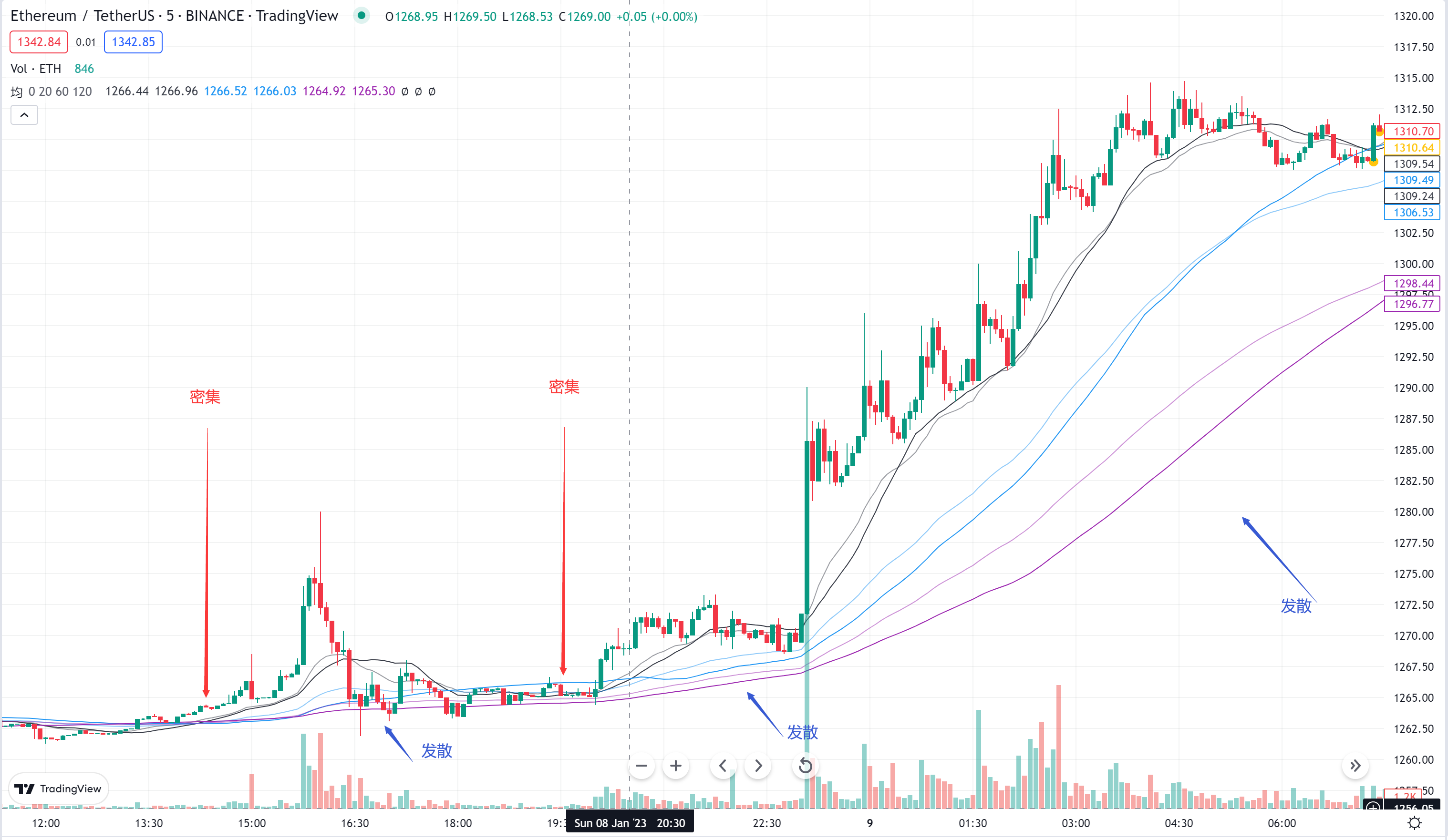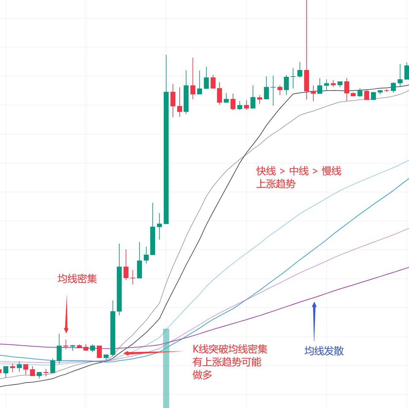 当均线密集时,表示市场处于震荡状态,此时不适合做多或做空。当均线发散时,表示市场处于趋势状态,此时适合做多或做空。